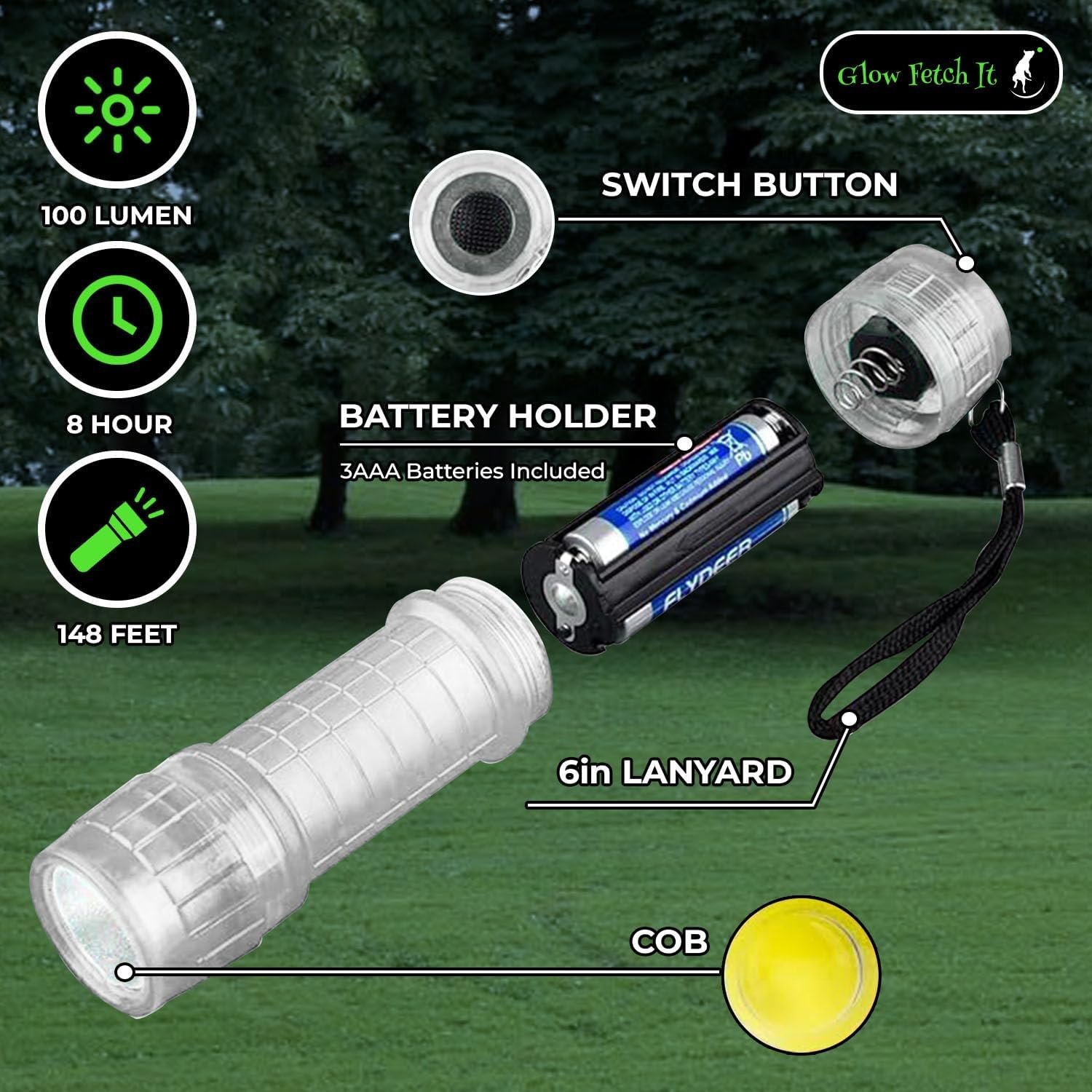 - Compact & Powerful Flashlight: Equipped with advanced LED COB technology, the white flashlight delivers 100 lumens of soft yet powerful light with a reach of up to 20 feet. Perfect for pet playtime, camping, or emergencies, it fits conveniently in pockets or bags for easy access.