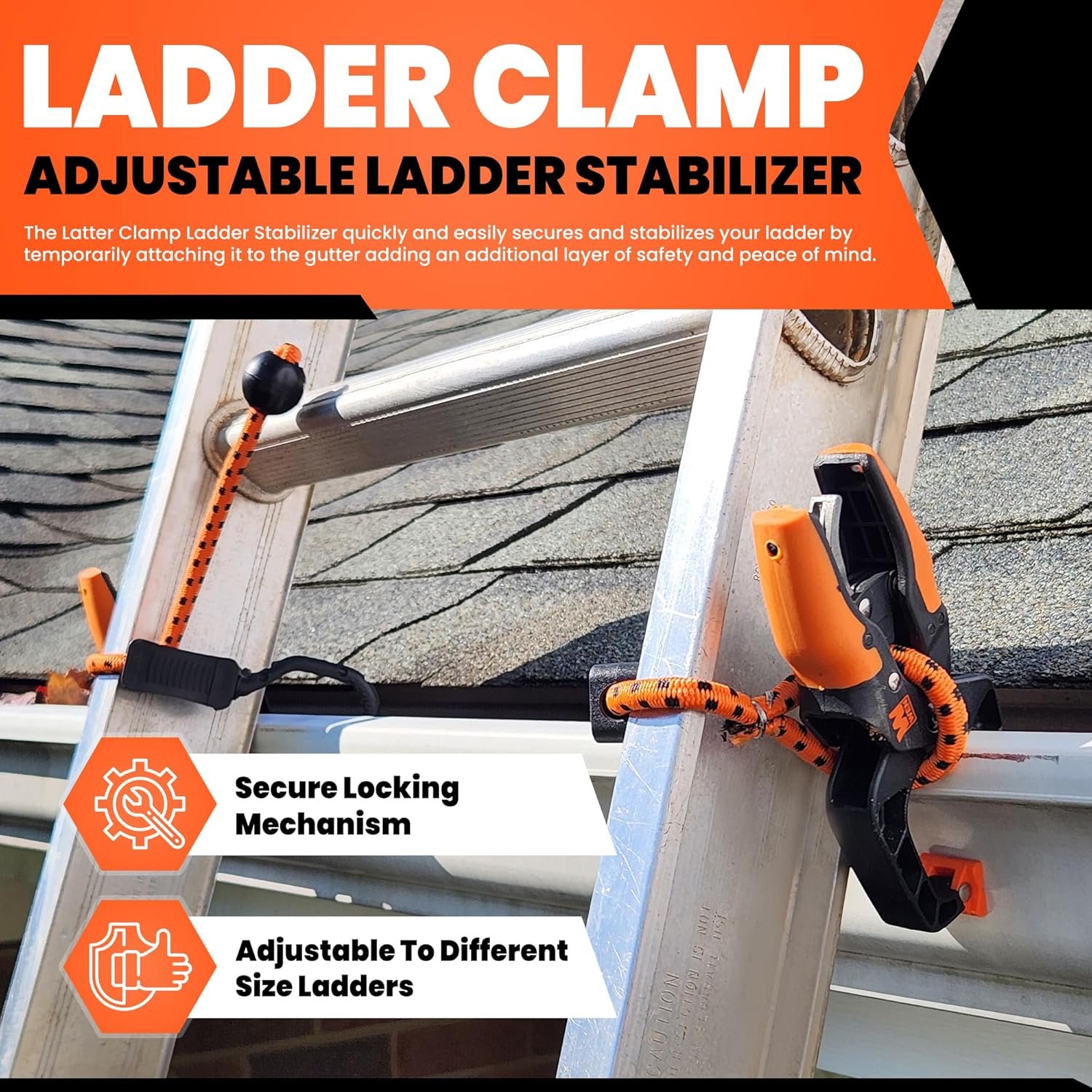 - Adjustable Ladder Stabilizer: This pair of ladder clamps allows you to securely attach your ladder to gutters in seconds, providing ultimate stability and safety. Adjustable bungee hooks allow clamps to fit all styles of ladders and gutters.